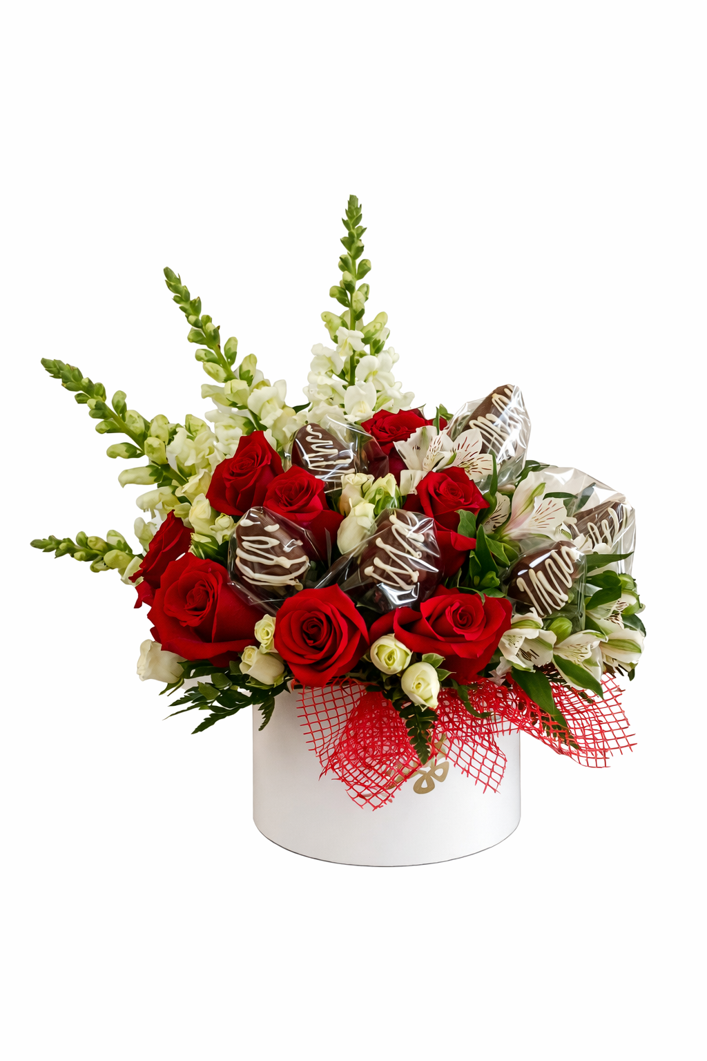Arreglo de rosas rojas , y complementos en tonos blancos , mas fresas con chocolate,