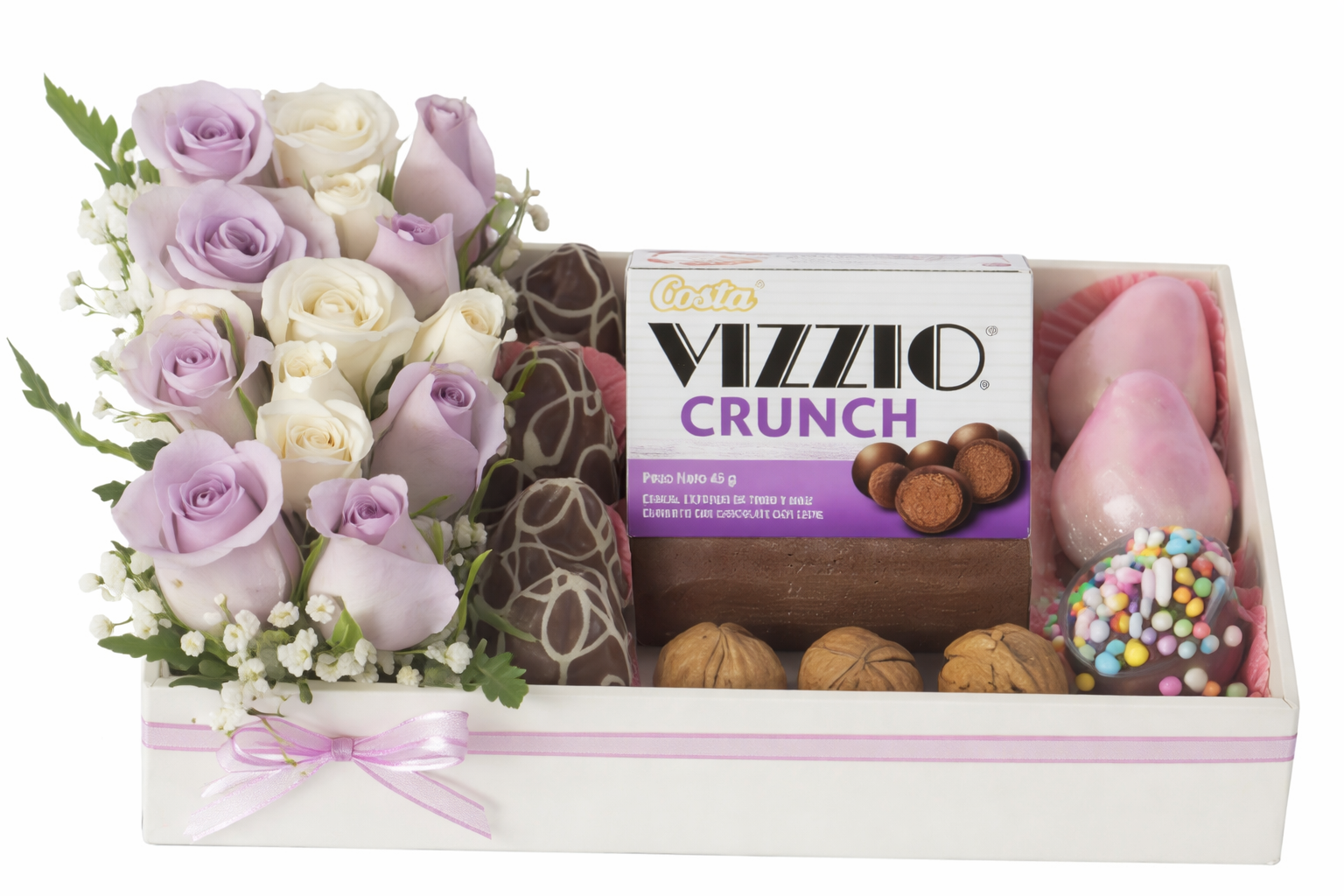 Un regalo especial con chocolates, rosas y fresas con chocolate. Un arreglo floral pequeño pero elegante.