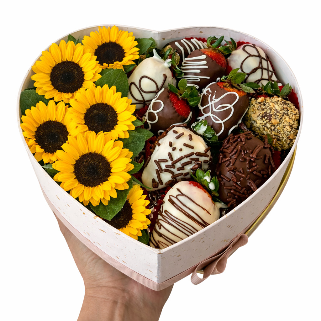 Arreglo de girasoles en base de corazon con fresas achocolatadas