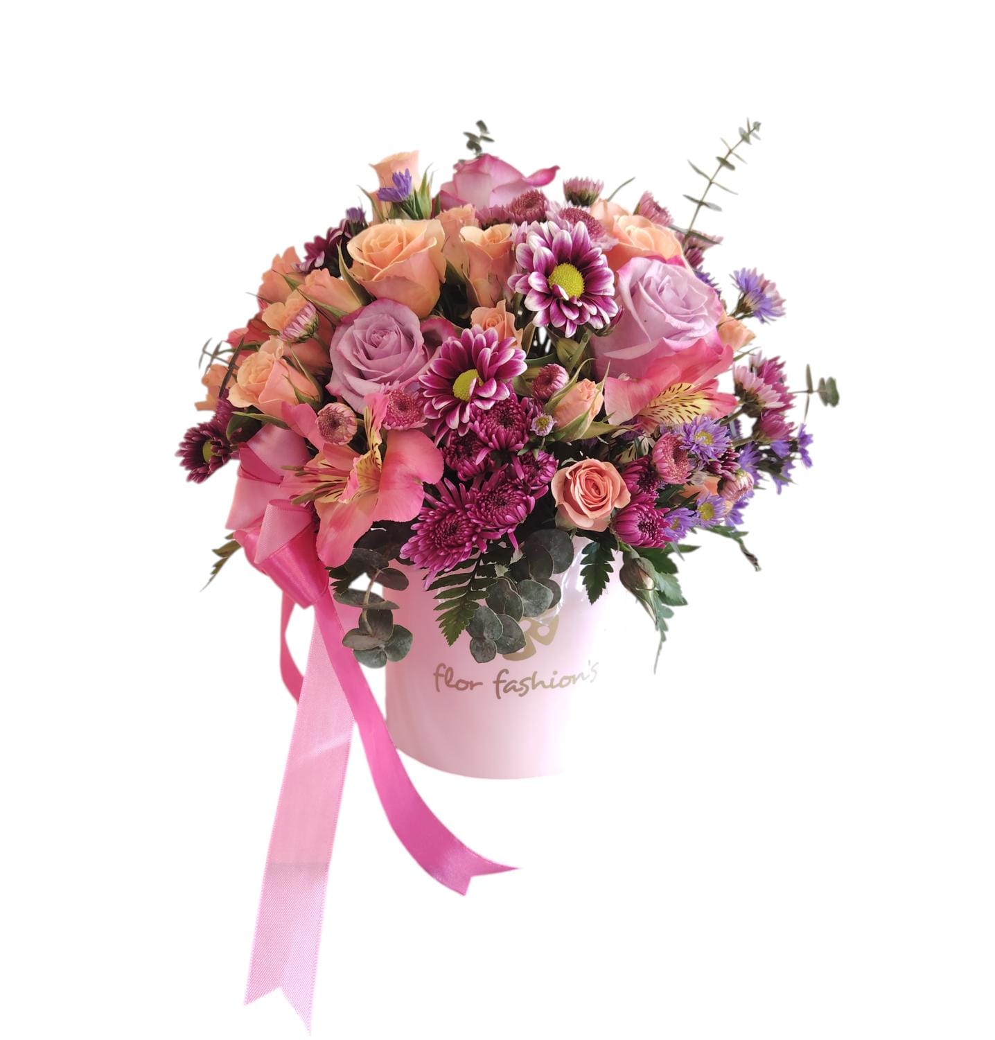 Arreglo floral base 12*12 de rosas, y complementos rosados, con detalle de laso.